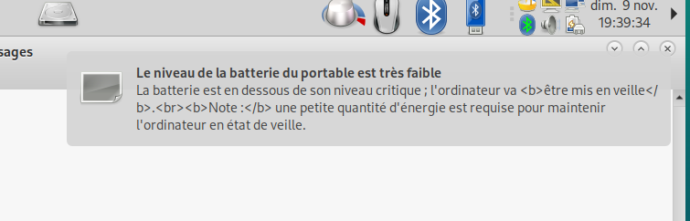 Il me semble que sur Mate l’applet c’est le «Gestionnaire d’énergie» (Bookworm) qui envoie un message popup dans cette situation (j’ai oublié si c’est 5% ou un autre niveau de charge), en plus de l’indiquer en permanence par l’aspect de son icône.