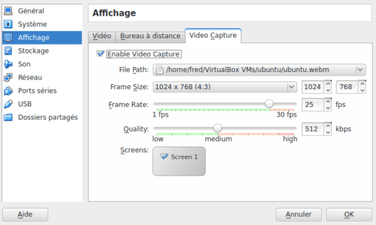 la capture video de ce qui se passe sur l’écran de la VM,c’est une option de virtualbox ,vous pouvez capturer un écran fixe comme vous pouvez capturer une vidéo en train de défiler et tout est géré par virtualbox et sauvegardé dans un fichier .webm lui même lisible par smplayer,vlc ou autres…qu’importe.La vidéo .webm est de bonne qualité mais je n’ai pas de son si je capture un fichier sonorisé genre youtube ou chaîne télé.Mais peut être que la capture du son n’est pas prévue,je n’en sais rien et c’est bien pour ça que je pose la question.