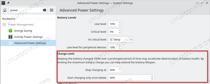 Setting battery charge thresholds from KDE Plasma desktopKDE plasma is a highly customizable desktop environment which includes a native graphical interface to change battery charge thresholds on notebooks whose firmware support this feature. All we have to do to navigate to “Power Management → Advanced Power Settings” in KDE system settings.