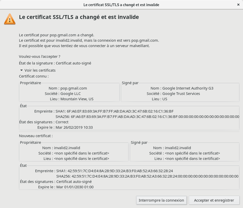 Claws Mail me mettait tout le temps le message : « Le certificat de sécurité du compte GMail a changé » assorti de la modification détaillée du certificat (c’était un nouveau à chaque fois).