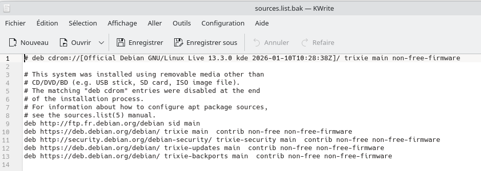 Voici le fichier « sources.list » initial qui a servi à l’installation de ma version DEBIAN :