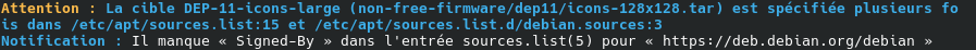 J’ai trouvé un autre fichier qui se trouve dans le dossier « etc/apc/ sources.liste.d » avec le nom « debian.sources » et qui semble être une traduction ou un rafraîchissement des sources DEBIAN à l’exception des deux dernières lignes (je ne peux le joindre ici car je n’ai droit qu’un seul fichier).
