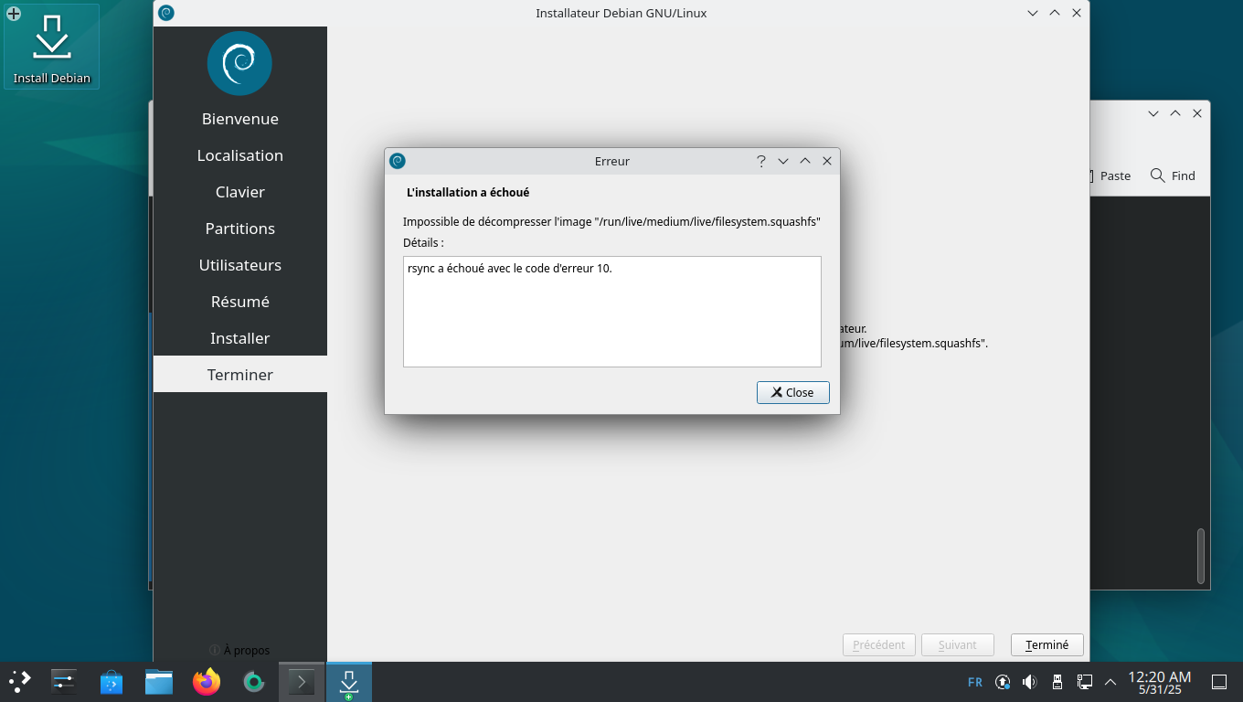 ** Echec de l’installation avec le motif : Impossible de décompresser l’image ‹ /run/live/medium/live/filesystem.squashfs ›, code erreur 10 retourné par rsync (erreur sur socket I/O)