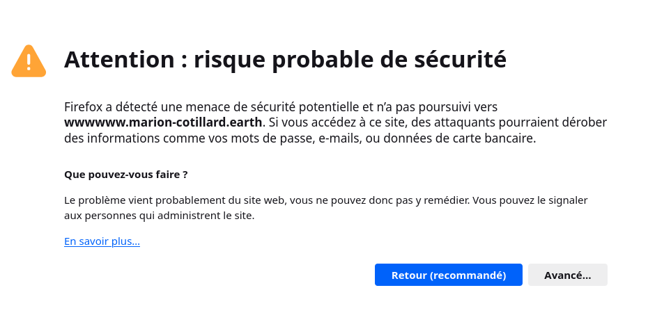 Juste en passant c’est illégal d’usurper le nom d’une personne pour faire un site. Quelle qu’en soit la raison. D’autant que le certificat n’est pas valide. Ce qui fait qu’il peut laisser à penser qu’il s’agit d’une fraude. Associé au nom de l’actrice c’est un délit d’usurpation d’identité avec intention potentiel de fraude ou de nuire.