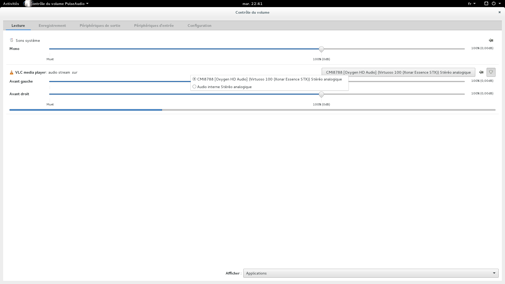 Lancez la lecture d’un fichier avec vlc,ouvrez pavucontrol et ouvrez l’onglet “lecture” en haut à gauche ,vous devez avoir vlc qui est listé,choisissez la sortie pour votre carte son.