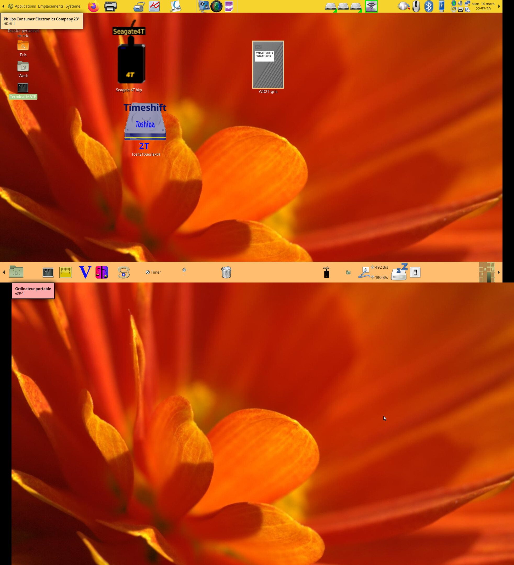 (icônes sur le bureau dans l’écran annexe, alors que l’écran du portable est défini comme principal).