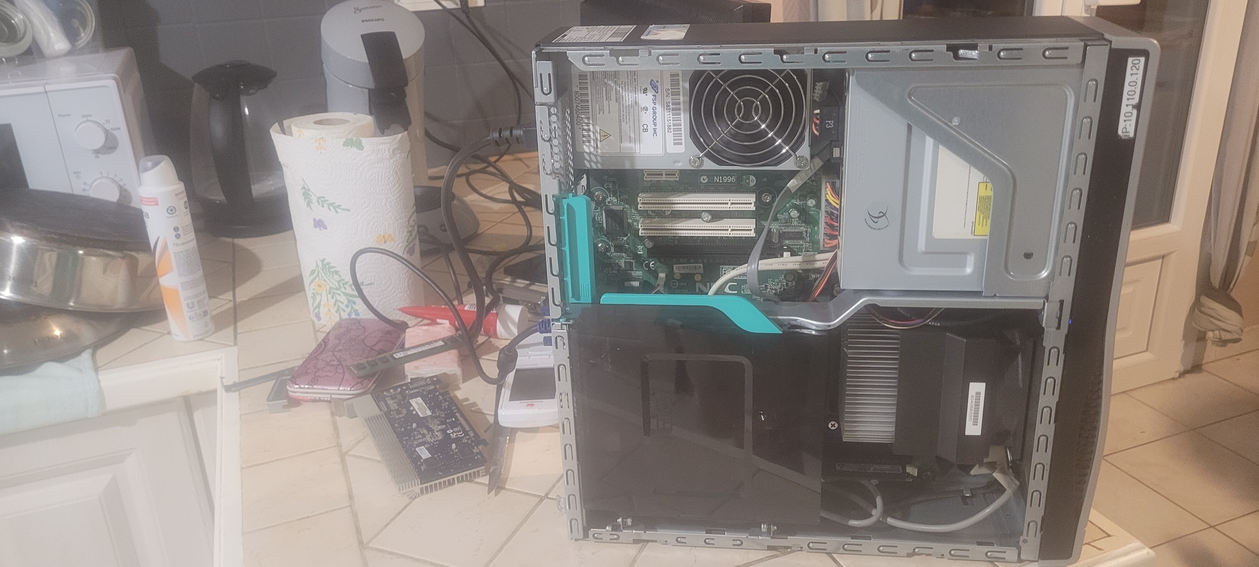 Bonjour, j’ai récupéré deux PC pour 5 euros à la brocante mais je n’arrive pas à les allumer. J’ai pourtant vérifié qu’il y avait tous les composants, j’ai rajouté une barette de 4go de RAM mais quand j’allume l’orrdinateur, il se passe quelque chose mais l’écran n’a pas de signal. Voilà des photos :
