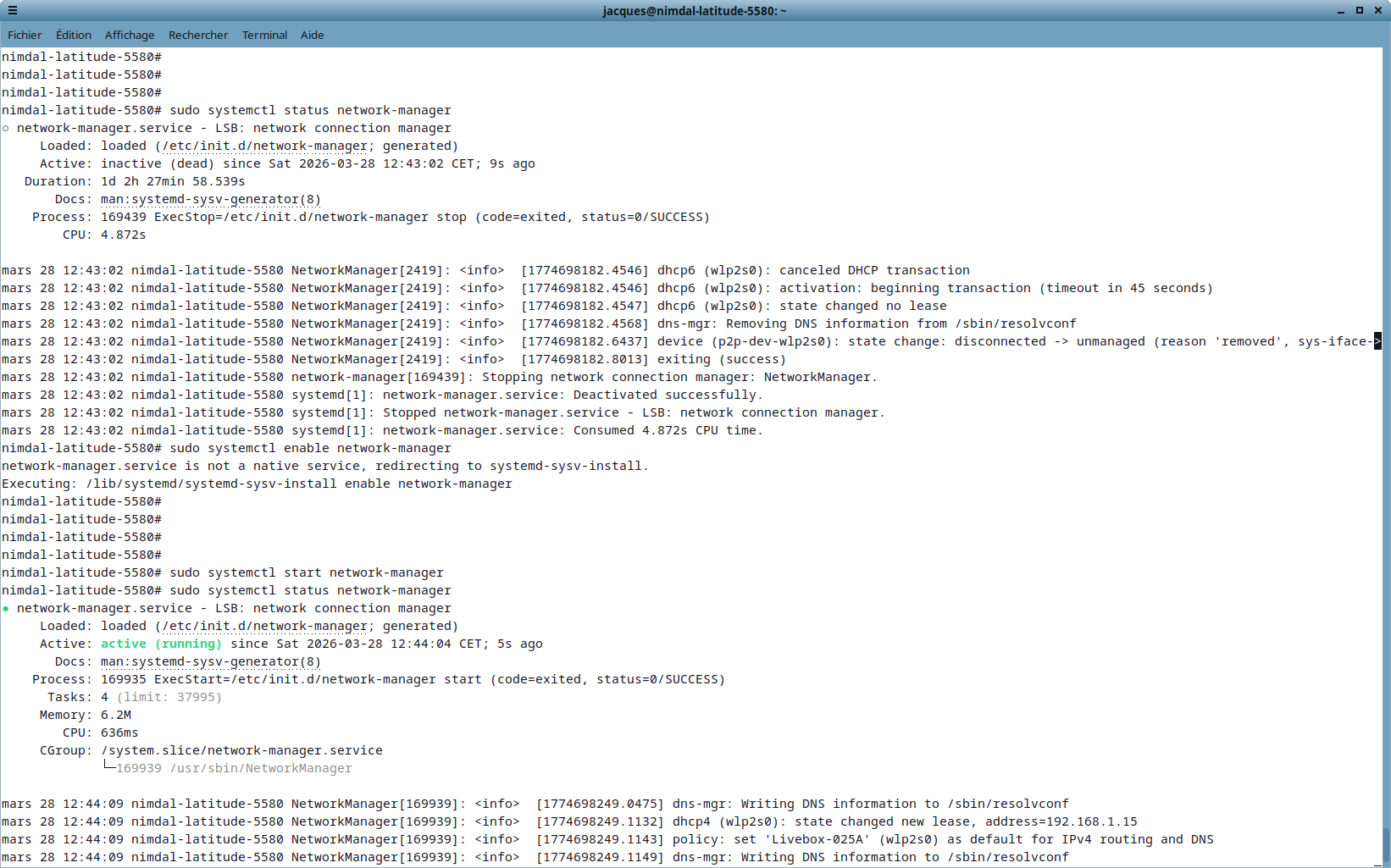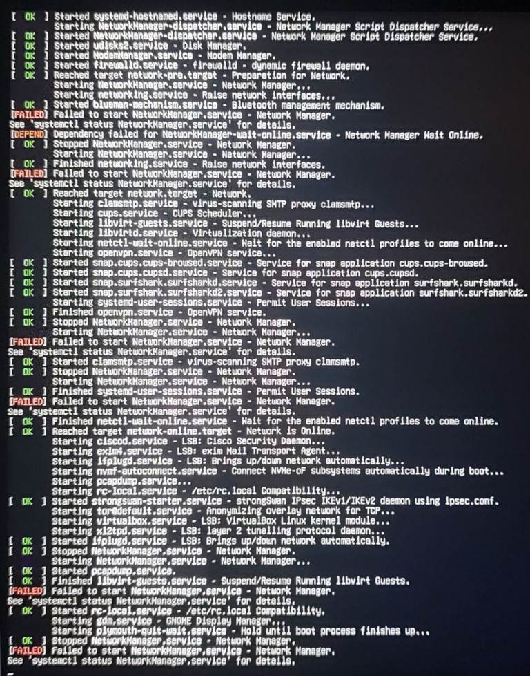 j’utilise Debian 12. Lors du « boot » de ma machine (DELL Latitude 5580), il est indiqué que le service (si j’ai bien compris) Network-Manager échoue à s’activer (c’est comme ça que j’interprète les choses peut être à tort): [FAILED] Failed to start NetworkManager.service. Je ne peux pas faire de mise-à-jour, autant avec Synaptic qu’en root dans une fenêtre Terminal avec la commande apt. Sur cette machine, j’ai un compte d’administration et un compte utilisateur pour information. Chose curieuse pour moi, je peux néanmoins utiliser un navigateur internet (firefox) et accéder à des pages web, et quand j’interroge le statut du service Natwork-Manager, il est actif! Donc actif pour Firefox (par exemple) mais pas pour « Synaptic » ou apt sous root.