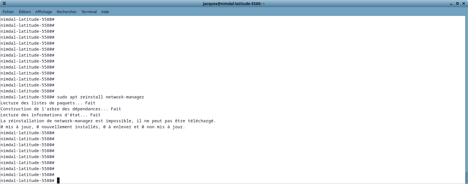 Le résultat est l’impossibilité d’installer des paquets par exemple. Je suis obligé de télécharger des fichiers deb pour cela et les installer avec GDebi. Je l’ai fait d’ailleurs pour Network-Manager et Network-Manager-gnome mais rien n’a changé.