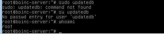Si c’est une commande updatedb appartenant aux outils qui se trouvent dans $BOINC_SOURCE/tools, alors, il faut l’appeler en précisant explicitement ou la trouver avec ./updatedb (ou bien $BOINC_SOURCE/tools/updatedb, et tu n’as pas besoin d’utiliser sudo, vu que tu es déjà en root).