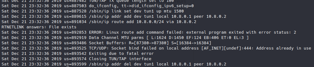 Bonjour, j’essaye de mettre en place un serveur OpenVPN et il semble y avoir un problème avec la configuration que j’ai faite car je n’arrive pas à m’y connecter et j’ai quelques erreurs dans mes logs.