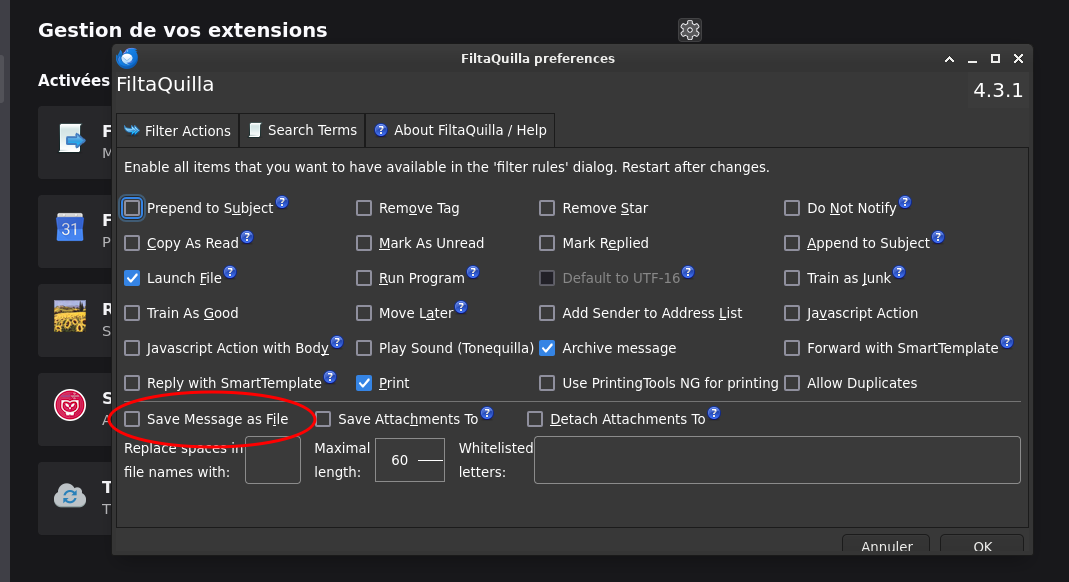 merci pour cette information. Si je peut trouver ce « Save Message as File » ce serait le pied. Pouvez-vous me donner chemin exacte pour trouver cette action. Depuis le menu Outil → Message_filter je ne trouve pas cela. Ais-je besoin de lunette ?