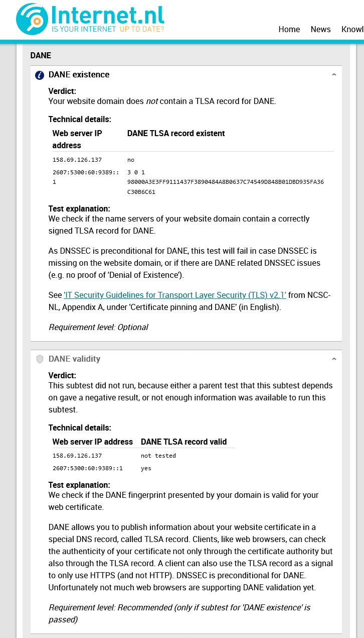 Je ne sais pas comment « internet.nl » me retourne cela : DANE existence → DANE TLSA record existance sur l’IPv4), mais bon - Auriez-t’il un soucis d’interrogation ?