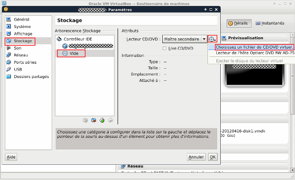 Tu peux graver l’iso et utiliser ton lecteur physique, ou alors dire à Virtualbox de monter l’image iso comme un cd virtuel.
